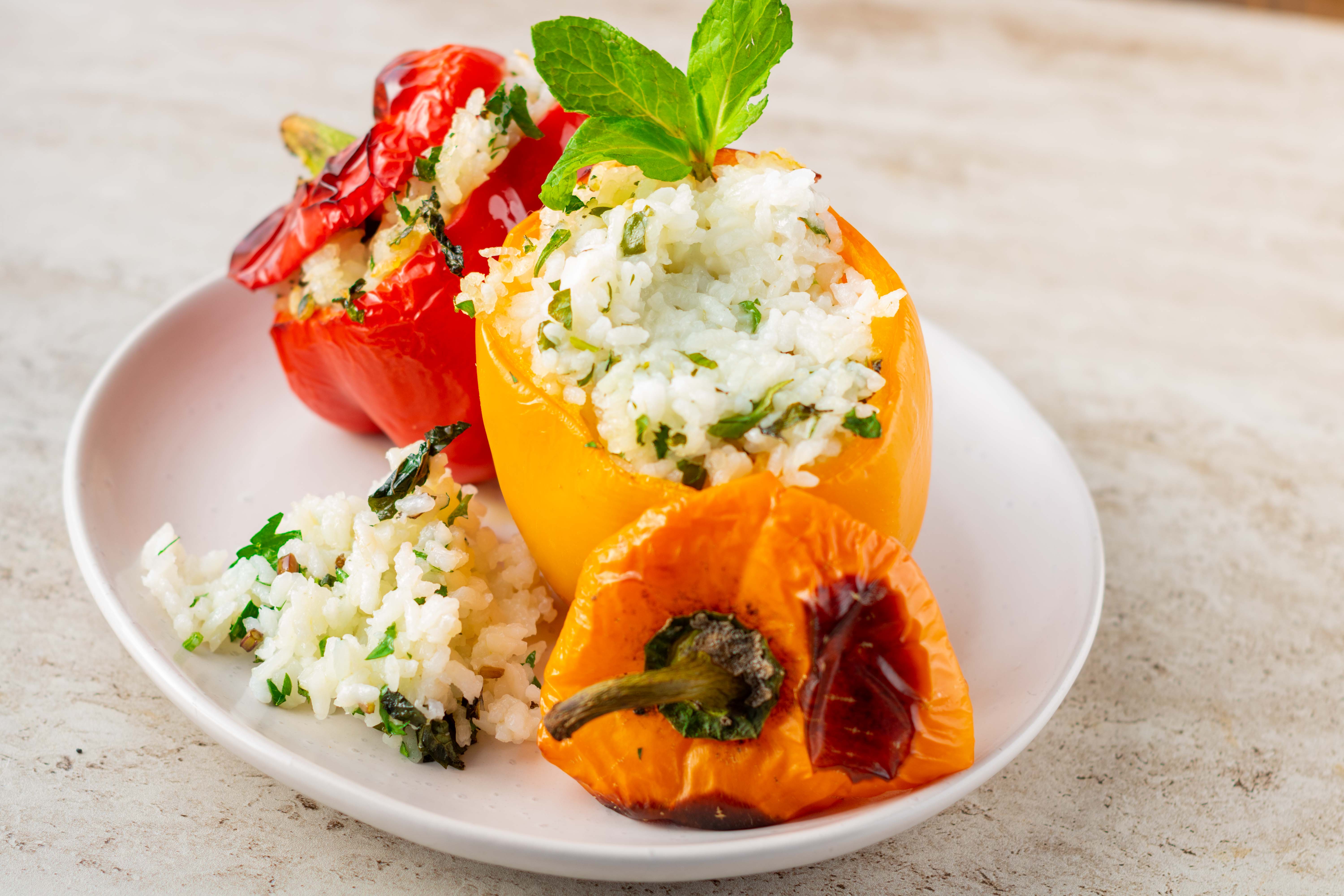 Instructions:1. Preheat oven at 400 Fahrenheit (200 Celsius). 2. Wash the peppers, cut around the stem, and empty the inside of the pepper. Place the peppers along with their caps n a large pan about 3 inches deep. 3. Add 2 cups of water to a pot, along with the rice, ½ cup olive oil , salt, tomato paste, and lemon juice. Bring to a boil then simmer until rice is cooked. Add, mint, parsley and lemon zest. 4. Start filling the tomatoes and peppers with rice all the way to the top and close with their caps. Drizzle with olive oil 5. Bake in the oven for about 15-20 minutes at 400 Fahrenheit | ||